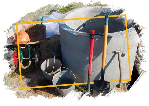 - Укрепление стен – после достижения необходимой глубины, стенки шахты укрепляются камнем или бетонными кольцами для предотвращения их обрушения.